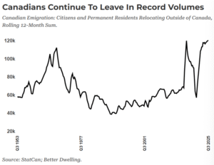 Canadians fleeing for greener pastures have climbed sharply in recent years. There have been 120,401 emigrants over the 12 months ending in Q3 2025, up 2.3% from last year. It’s now at the largest outflow on record, and not just for Q3, but for any 12 month period in Canadian history.