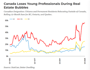 The 2017 surge follows a similar path, coinciding with a regional real estate bubble. Roughly 80% of emigration at the Q2 2017 peak were from just three provinces—BC, Ontario, and Quebec. All three had just seen a sharp collapse in affordability, and this is right around when two of those provinces implemented non-resident speculation taxes to cool the speculative mindset. We call the outcome “brain drain,” but it wasn’t competition that pushed talent out—it was a housing bubble and the massive misallocation that follows.